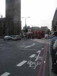IN REALITY: In both the above cases, the footage is shot at the North end of Westminster Bridge, in front of the Houses of Parliament. The picture to the left shows the view of Number Six and Butler running for the bus, the bottom photo is the view of them boarding the bus. This location forms part of the twice-yearly Prisoner Location Walkabouts (details on our events page).
